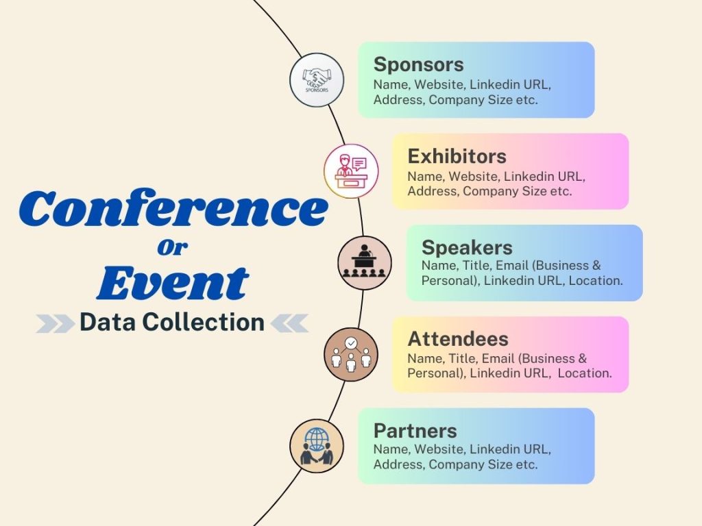 We can identify targeted events and collect all relevant information, including exhibitors, sponsors, speakers, partners, and attendees, along with their contact details.